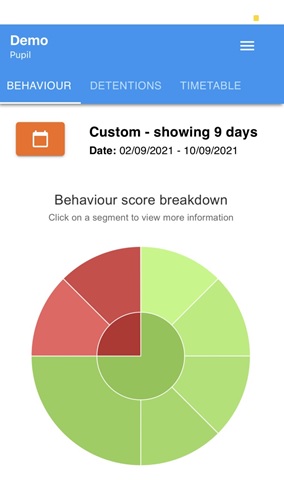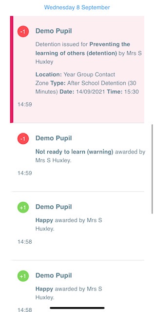 Below these graphs you will find a list of behaviour activity relating to you. These display the behaviour that was awarded, when it was awarded, who awarded the behaviour, the lesson the behaviour was awarded in, and how many points the award is worth. The level of detail within each behaviour award depends on the settings that your school has enabled.